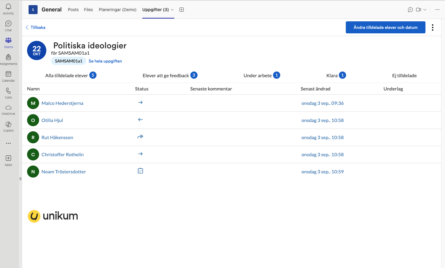 Med Unikums provisionering kan lärare och elever arbeta direkt i Microsoft Teams. Uppgifterna görs direkt i Teams och är synkade med Unikum så lärare har allt underlag samlat när det är dags för bedömning. Ta gärna kontakt med centralt ansvarig i din kommun, eller er kontaktperson på Unikum för mer information om Unikums provisionering.
