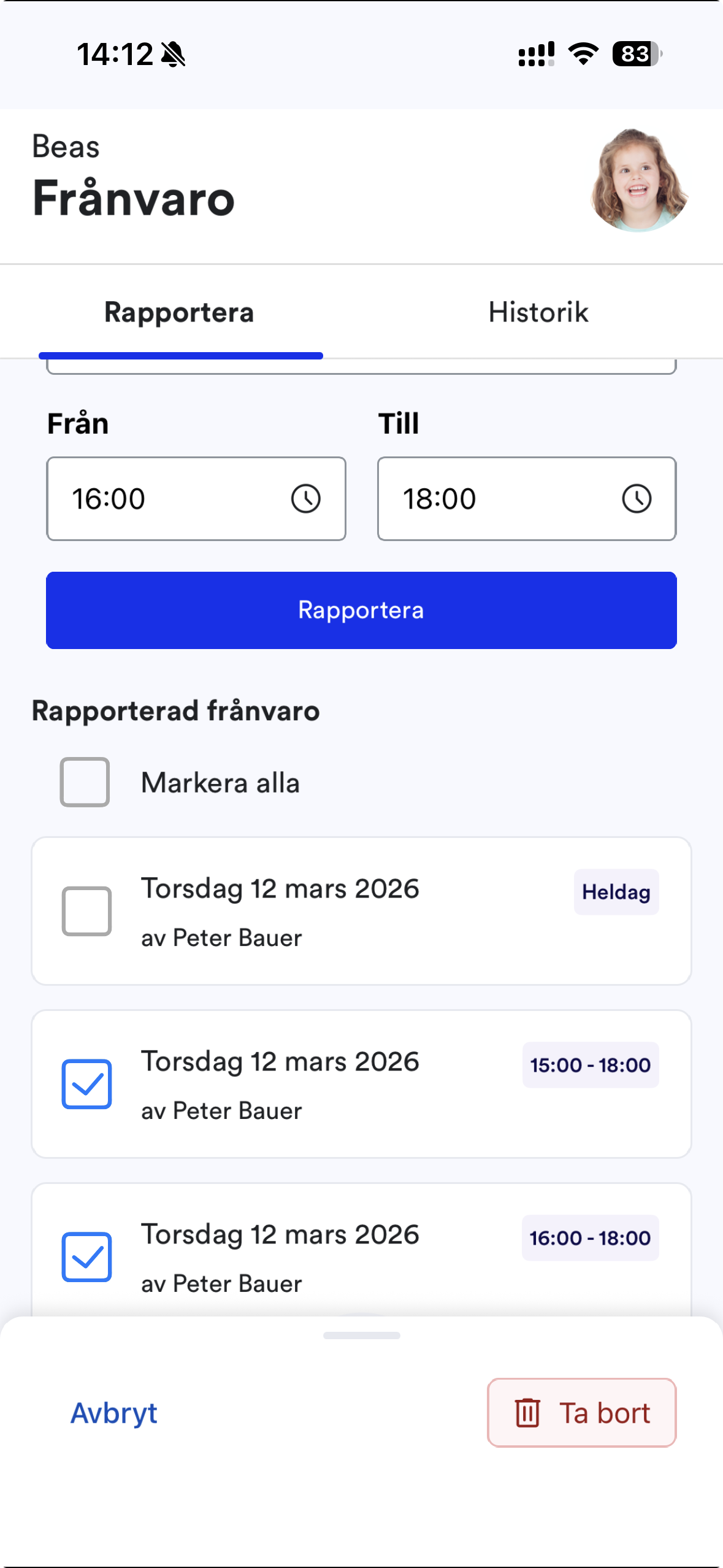 Anmäl frånvaro för hela dagen/del av dag (inklusive skolan för fritidsbarn)