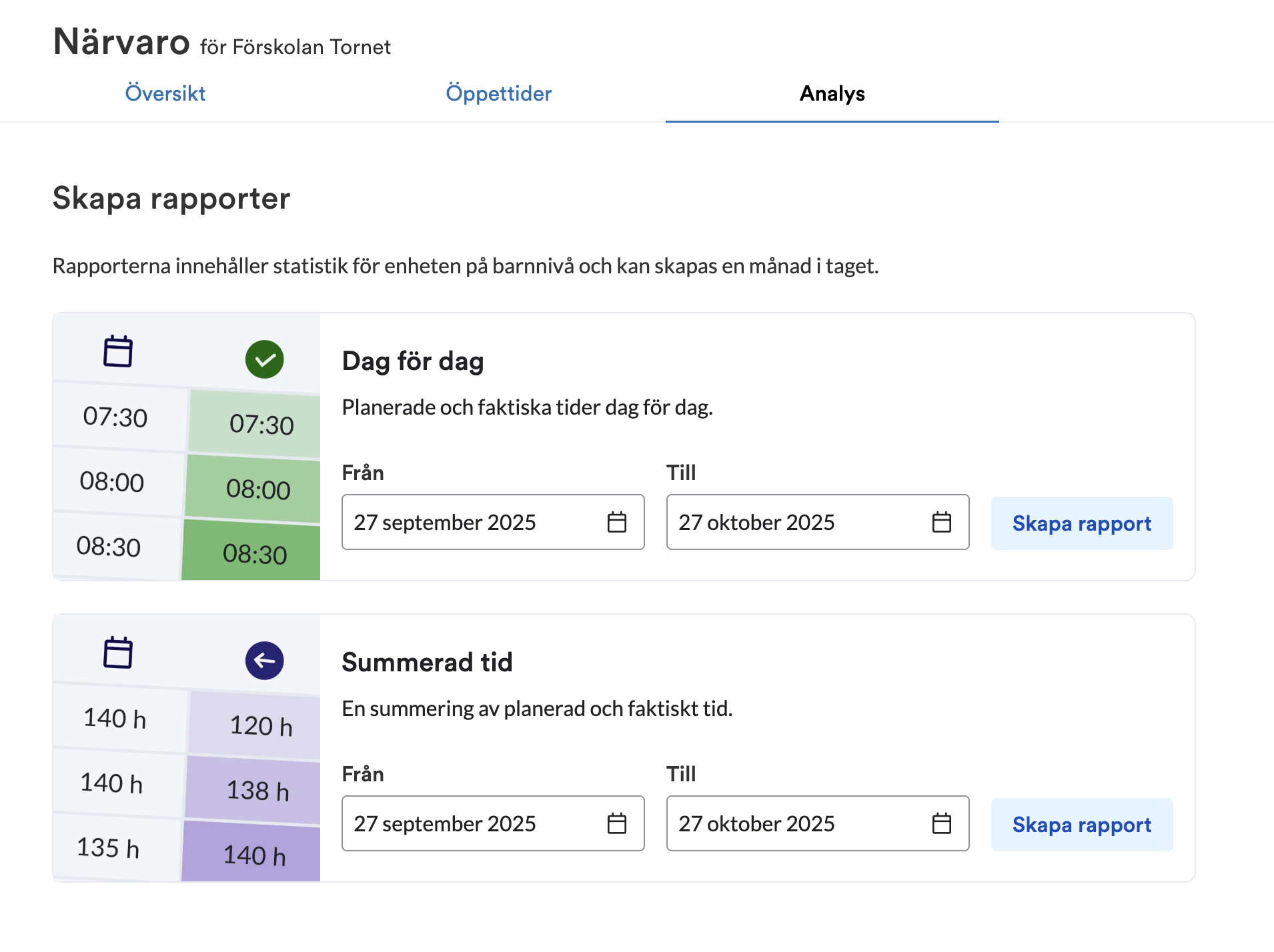 Rapporten dag för dag tar ut en detaljerad rapport med varje barns planerade och faktiska närvaro inom intervallet för rapporten. Rapporten Summerad tid visar en summering av varje barns planerade och faktiska närvaro inom intervallet för rapporten.
