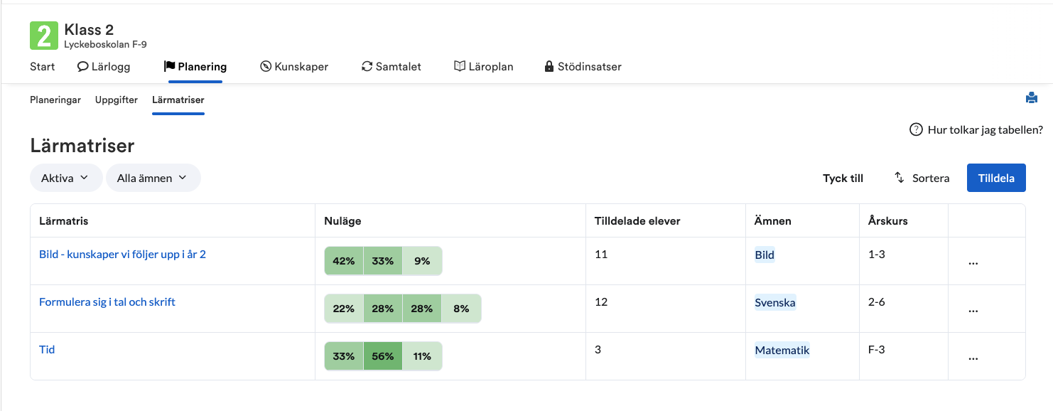Lärare får en samlad överblick av elevernas uppfyllelse i en lärmatris genom att gå till Grupp > Planering > Lärmatriser. Översikten visar endast fristående lärmatriser - matriser i en planering visas inte här.