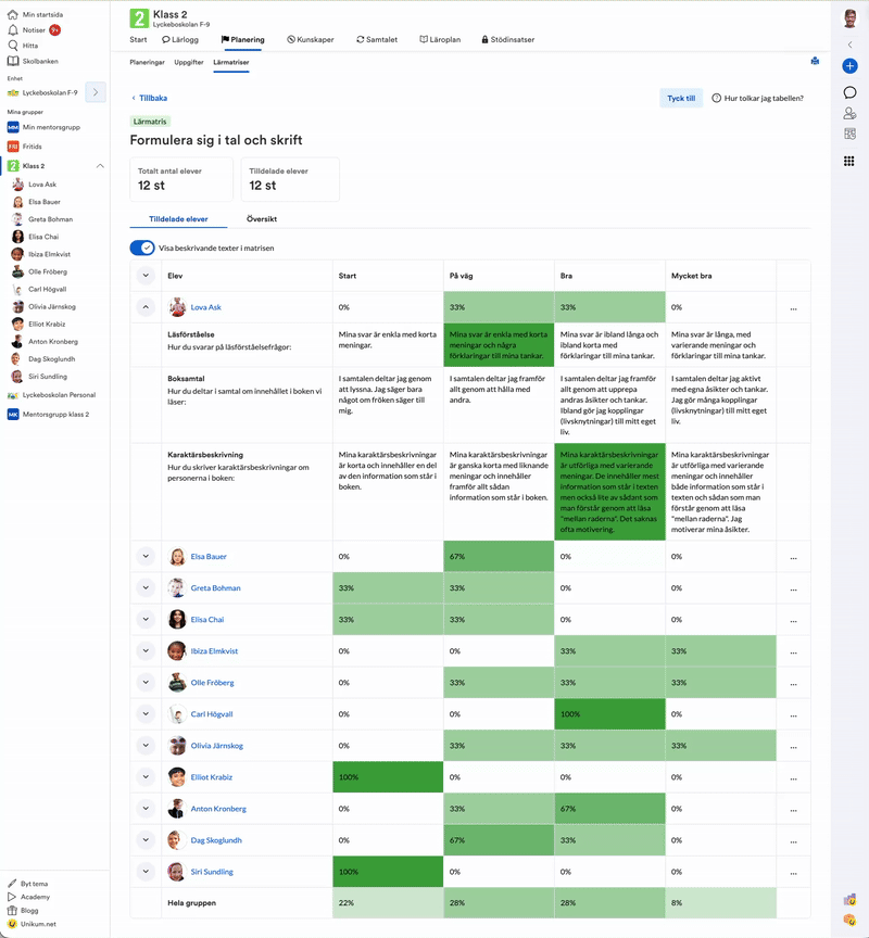 När man går in på matrisen får man en mer detaljerad överblick hur respektive elev ligger till och fäller man ut raderna under eleverna kan man direkt klicka i celler för respektive elev.