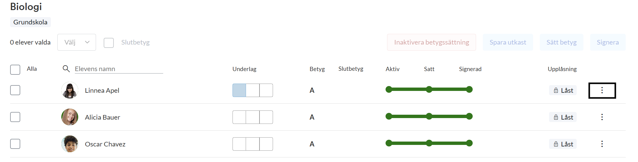 För att låsa upp klickar man på de tre prickarna vid eleven i fråga, och klickar på “begär upplåsning”. Detta gör man enklast genom att först navigera till klassen, klicka på kunskaper ->betyg, gå in på ämnet där det felaktiga betyget ligger.