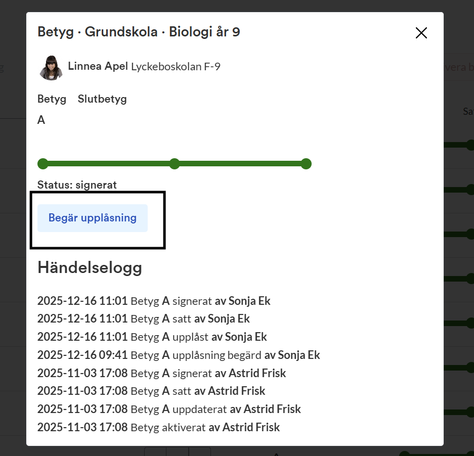 Klicka på begär upplåsning. Administratör får då en notis att det har begärts en upplåsning. När administratör har låst upp, så får lärare i sin tur en notis att det har låsts upp och kan sätta och signera ett korrekt betyg.